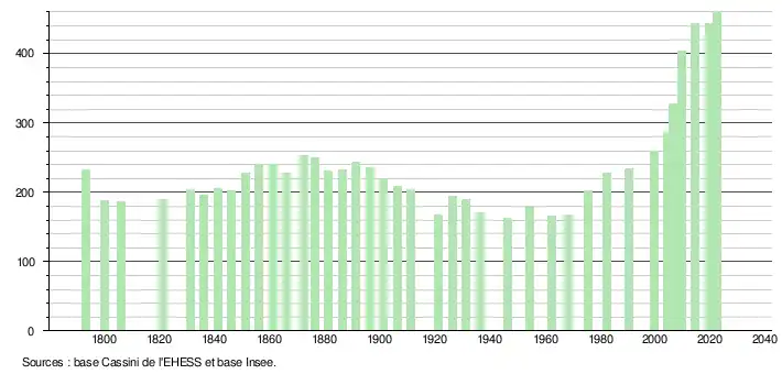 L'évolution du nombre d'habitants est connue à travers les recensements de la population effectués dans la commune depuis 1793. Pour les communes de moins de 10 000 habitants, une enquête de recensement portant sur toute la population est réalisée tous les cinq ans, les populations de référence des années intermédiaires étant quant à elles estimées par interpolation ou extrapolation[18]. Pour la commune, le premier recensement exhaustif entrant dans le cadre du nouveau dispositif a été réalisé en 2004[19].
