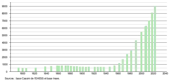 L'évolution du nombre d'habitants est connue à travers les recensements de la population effectués dans la commune depuis 1793. Pour les communes de moins de 10 000 habitants, une enquête de recensement portant sur toute la population est réalisée tous les cinq ans, les populations de référence des années intermédiaires étant quant à elles estimées par interpolation ou extrapolation[17]. Pour la commune, le premier recensement exhaustif entrant dans le cadre du nouveau dispositif a été réalisé en 2007[18].
