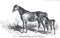« La race poitevine mulassière est originaire des marais de la Vendée […] Baignant dans l'humidité, le pied était large, les membres garnis de crins longs et touffus ; mais par-dessous, les os étaient gros et les tendons larges et forts. La tête est longue et aussi les oreilles ; la crinière épaisse, les poils abondants ; l'encolure est forte, le garrot bien sorti ; le rein est un peu bas ; la croupe est large et allongée ; les fesses et les cuisses sont bien musclées, les jarrets forts, le ventre très-développé ; la poitrine est ample. La robe la plus générale était noire ou bai-brun. »
