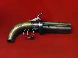 Vers 1830, l'adoption du mécanisme à simple action permet aux canons de tourner automatiquement lorsque l'on arme le chien. En 1837, avec l'invention de l'américain Ethan Allen[2], le mécanisme à double action se généralise. Ce dispositif permet de faire tourner les canons et d'armer le chien en appuyant sur la détente. Le chien n'est plus apparent et se trouve dans l'axe de la détente, il agit sur le canon inférieur.