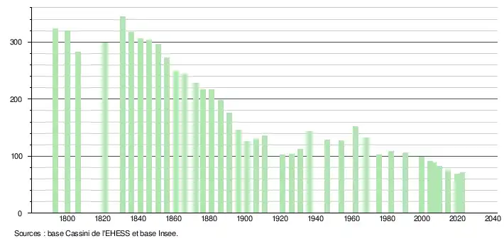 L'évolution du nombre d'habitants est connue à travers les recensements de la population effectués dans la commune depuis 1793. Pour les communes de moins de 10 000 habitants, une enquête de recensement portant sur toute la population est réalisée tous les cinq ans, les populations de référence des années intermédiaires étant quant à elles estimées par interpolation ou extrapolation[45]. Pour la commune, le premier recensement exhaustif entrant dans le cadre du nouveau dispositif a été réalisé en 2004[46].