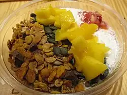 Des variantes de poke bowl à base de céréales et morceaux de fruits (pépite de chocolat, raisin sec, ananas, mangue, banane, pomme, poire, kiwi, fraise, framboise, grenade, noix de coco) peuvent faire office de dessert[14].