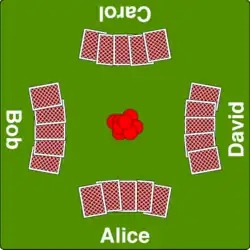 Si le donneur est un joueur, chacun tire une carte avant le début de la partie. Celui qui tire la carte la plus haute distribue le premier ; les autres joueurs distribueront ensuite tour à tour.