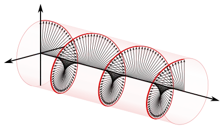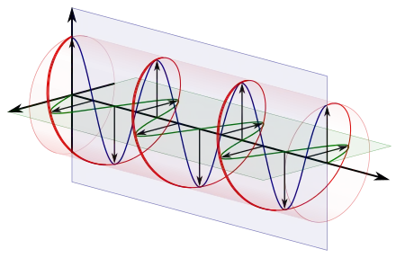 À droite se trouve une illustration des vecteurs champ électrique d’une onde électromagnétique polarisée circulairement. Le champ électrique de ces vecteurs a une norme constante, mais sa direction change selon un mouvement de rotation. Étant donné qu'il forme une onde plane, chaque vecteur représente la norme et la direction du champ électrique pour un plan entier qui est perpendiculaire à l’axe. deux images dans l’article sur les ondes planes pour mieux illustrer le concept.