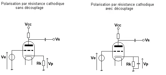 Le courant de repos circulant entre Vcc et la masse du montage, il se crée une différence de potentiel aux bornes de Rk (égale à Rk*i), cette tension (Vp) fait que le potentiel de la cathode s'élève par rapport à la tension de la grille, ainsi la grille de contrôle devient négative par rapport à la cathode. Le découplage (ajout du condensateur), permet de maintenir Vp constant lors de l'application d'une tension alternative Ve. En l'absence de ce condensateur de découplage, Vp varie en fonction du courant dans le tube, ce qui réduit le gain du montage.