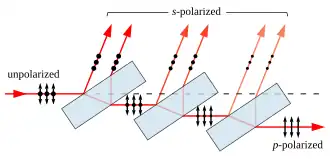 La façon la plus simple d'en réaliser consiste en une série de lames de verre orientées à l'angle de Brewster par rapport au faisceau. À cet angle, valant environ 57° pour le verre, la lumière polarisée p (c'est-à-dire parallèlement au plan d'incidence, vient de parallel, « parallèle » en allemand) n'est pas réfléchie par le verre et 84 % de la lumière polarisée s (perpendiculairement au plan d'incidence, vient de senkrecht, « perpendiculaire » en allemand) est transmise (16 % est réfléchie). Chaque lame de verre réfléchit deux fois la lumière (à l'entrée et à la sortie).