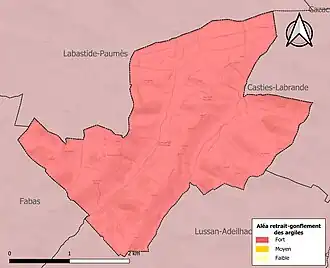 Le retrait-gonflement des sols argileux est susceptible d'engendrer des dommages importants aux bâtiments en cas d’alternance de périodes de sécheresse et de pluie. La totalité de la commune est en aléa moyen ou fort (88,8 % au niveau départemental et 48,5 % au niveau national). Sur les 33 bâtiments dénombrés sur la commune en 2019, 33 sont en aléa moyen ou fort, soit 100 %, à comparer aux 98 % au niveau départemental et 54 % au niveau national. Une cartographie de l'exposition du territoire national au retrait gonflement des sols argileux est disponible sur le site du BRGM[24],[Carte 3].