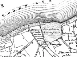 Ci-contre carte de Cuyper (vers 1865) montrant le Polder noir inondé et, sur son côté ouest, les deux polders repris sur la mer.