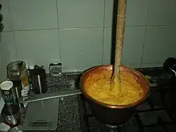 On utilise une cuillère en bois (ou un bâton) pour éviter que la préparation n'attache pendant la cuisson. Parfois, on utilise un rameau dont on a enlevé l'écorce et auquel on a laissé la naissance de quatre branches. Le chaudron de cuivre à fond sphéroïdal facile à racler était un luxe de cuisinier, idéal pour ceux qui en avaient les moyens. Une phase au four peu courante simplifiait l'obtention correcte de l'état final de cuisson. Les autocuiseurs ont aussi beaucoup changé les habitudes. L'industrie alimentaire actuelle propose aujourd'hui des polentas précuites, plus rapides à préparer avec un temps de cuisson de cinq minutes au lieu des quarante-cinq minutes traditionnelles.