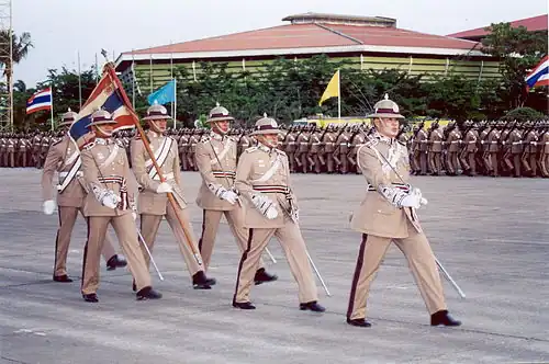 Des officiers et des élèves-officiers défilent avec l'étendard à la place Sriyanon.