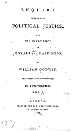 Enquiry Concerning Political Justice and its Influence on Modern Morals and Manners, de 1793 (Enquêtes concernant la justice politique et son influence sur la morale et les manières modernes) trace la philosophie politique du philosophe du XVIIIe siècle William Godwin.
