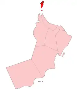 Le sultanat d'Oman partage avec les Émirats arabes unis une frontière de 410 kilomètres, dont la particularité est de suivre deux tracés non continus. Deux exclaves d'Oman ne sont accessibles qu'en passant par le territoire des Émirats arabes unis : la ville de Madha, de 75 kilomètres carrés et d'environ 3 000 habitants[22] et surtout le péninsule de Moussandam, de 32 000 habitants[23]. La position de cette dernière est stratégique car celle-ci ferme le détroit d'Ormuz[23] par lequel transitent 40 % des exportations mondiales de pétrole par voie maritime[13].