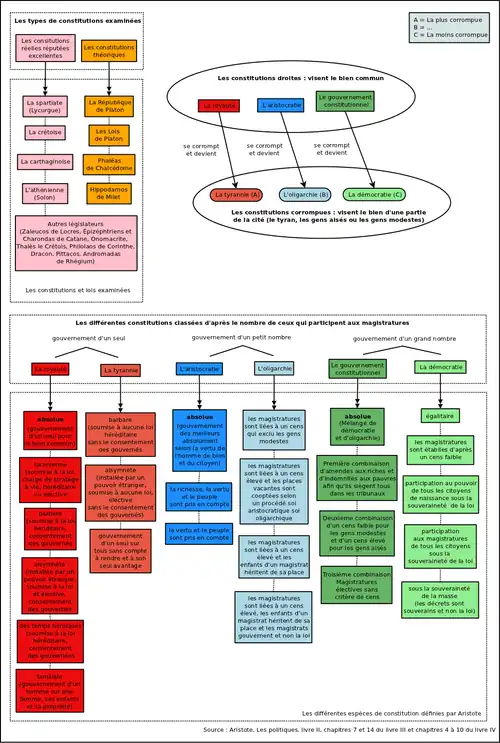 Aristote passe en revue diverses constitutions, telles celle d’Hippodamos de Milet, de Sparte, de Crète, de Carthage et d'Athènes[A 76], mais souligne qu’il n’existe pas de constitution parfaite pour toutes les circonstances[A 77]. Il commence par identifier trois principaux types de constitutions selon que le pouvoir est exercé par un seul, par plusieurs ou par la multitude; mais une classification purement juridique des régimes n’a pas d’intérêt, la loi n’est pas tout; plusieurs autres critères entrent en ligne de compte, en particulier la classe sociale au pouvoir, la naissance, la pratique des institutions, et la manière de gouverner, en vue de l’intérêt général ou de l’intérêt d’un seul. Aristote intègre aussi dans le droit la notion de lois non écrites (ἄγραφοι νόμοι) inventée par la pensée grecque[A 78]; ce sont d’une part les lois tirées de la coutume (ἔθη), usages nationaux très anciens qui se perpétuent et assurent la cohésion sociale, et d’autre part la loi naturelle ou universelle, commune à tous les hommes[78].