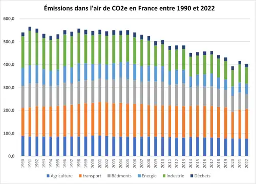 En 2021, la France (Métropole et Outre-mer inclus dans l'UE) a émis 414,8 Mt CO2e, hors puits de carbone, ce qui reste inférieur au niveau d’avant crise sanitaire (431,1 Mt CO2e en 2019), mais supérieur à 2020 (392,3 Mt CO2e) dont le faible niveau était lié à la crise sanitaire mondiale de la Covid-19. Ce rebond est particulièrement marqué pour les transports (+12,4 %) et pour l’industrie (+8,2 %). Entre 1990 et 2021, les émissions annuelles de gaz à effet de serre en France (Métropole et Outre-mer inclus dans l’UE ; hors secteur UTCATF) sont passées de 544 Mt CO2e en 1990 à 415 Mt CO2e en 2021, soit une baisse de 24 %[18].
