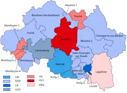 La préfecture, Moulins, est également une ville marquée à droite. Après la guerre de 39-45, elle est notamment gérée par le résistant sans étiquette Maurice Tinland, qui devient maire assez jeune à l'âge de 32 ans en 1947. Il reste en place jusqu'en 1959. Parmi ses successeurs, on trouve Hector Rolland, maire de 1971 à 1989, également député RPR qui a mené l'opposition à la Loi Veil sur l'IVG. Depuis 1995, c'est Pierre-André Périssol qui dirige la ville pour la droite.