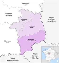 La préfecture du Cher est localisée à Bourges. Le département possède en outre trois sous-préfectures à Saint-Amand-Montrond et Vierzon. Jusqu'en 1926, le département possédait un arrondissement supplémentaire à Sancerre.