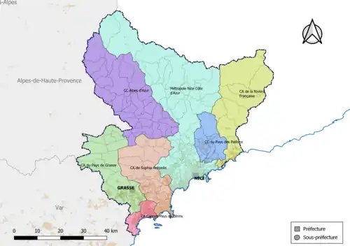 La préfecture des Alpes-Maritimes est localisée à Nice. Le département possède en outre une sous-préfecture à Grasse. Jusqu'en 1926, un arrondissement supplémentaire était situé à Puget-Théniers.