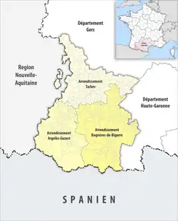 La préfecture des Hautes-Pyrénées est localisée à Tarbes. Le département possède en outre deux sous-préfectures à Argelès-Gazost et Bagnères-de-Bigorre.