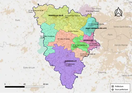 Depuis le redécoupage cantonal de 2014, un canton peut contenir des communes provenant de plusieurs arrondissements. Cela concerne les six cantons yveliniens suivants : Aubergenville, Le Chesnay-Rocquencourt (anciennement canton du Chesnay), Maurepas, Plaisir, Saint-Cyr-l'École et Trappes.