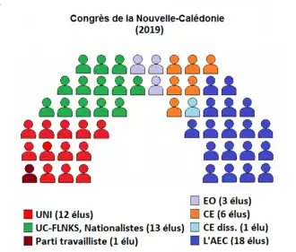 Le Congrès de la Nouvelle-Calédonie est composé de 54 membres issus proportionnellement des trois Assemblées de Province élus tous les 5 ans au suffrage universel direct par les citoyens calédoniens (ceux pouvant attester d'une présence sur le territoire avant 1998) au scrutin proportionnel de listes à un tour. L'actuel Congrès, dans sa cinquième mandature depuis l'accord de Nouméa, est issu des élections provinciales du , et sa composition au est la suivante :