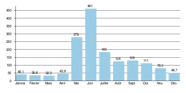En considérant la seule période estivale, libre de glaces (de juin à septembre inclus), le débit mensuel minimal observé a été de 58 m3/s en , ce qui restait très confortable, voire abondant.