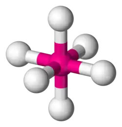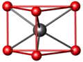| 6 | octaèdre | ![]() | Ti dans l'ion hexaaquatitane(II) Ti(H2O)62+ | Na et Cl dans NaCl[15], Ti dans BaTiO3 (structure pérovskite)[16], Ni dans la breithauptite NiSb[17] |