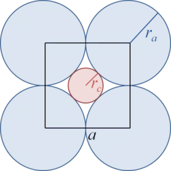 Les centres des ligands constituent un carré de côté . Il suffit de déterminer l'arête du polyèdre de coordination et sa demi-diagonale en fonction des rayons ioniques et :