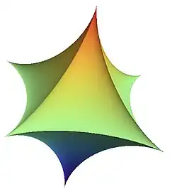 La surface de tout polyèdre idéal à sommets peut être subdivisée en triangles idéaux[7], chacun ayant une aire égale à [1]. L'aire de la surface d'un polyèdre idéal est donc exactement .