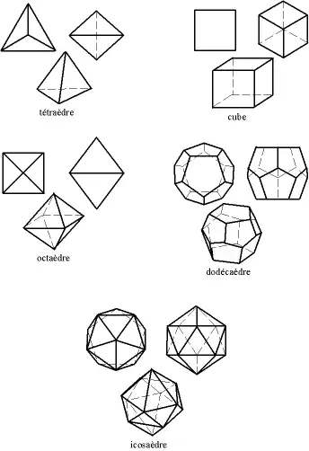 Platon considérait ces solides comme l'image de la perfection ; pour lui, comme il l'explique dans le Timée, le tétraèdre est le symbole du feu, l'octaèdre celui de l'air, l'icosaèdre celui de l'eau, le cube celui de la terre et le dodécaèdre celui de l'univers tout entier.