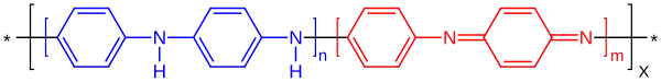 L'aniline peut polymériser en formant des liaisons amine C–NH–C ou des liaisons imine C=N–C dont la proportion respective détermine le degré d'oxydation du polymère final : les liaisons amine correspondent à l'état réduit tandis que les liaisons imine correspondent à l'état oxydé. Si l'on désigne par m la fraction de liaisons imine (état oxydé) et n la fraction de liaisons amine (état réduit) alors on distingue les trois états d'oxydation typiques suivants :