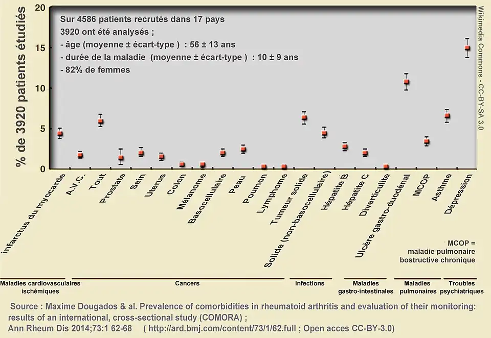 - 1 2 3 (en) Maxime Dougados et al. « Prevalence of comorbidities in rheumatoid arthritis and evaluation of their monitoring: results of an international, cross-sectional study (COMORA) » ; Extended report ; Clinical and epidemiological research. Ann Rheum Dis. 2014;73:62-68 ; DOI 10.1136/annrheumdis-2013-204223.