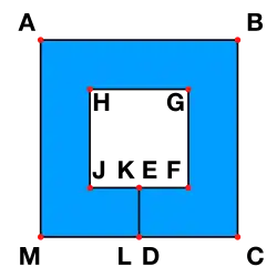 Si une ligne polygonale fermée du plan divise celui-ci en deux domaines tous les deux équivalents à un disque, alors la ligne polygonale est appelée un polygone faiblement simple. De manière moins formelle, un polygone faiblement simple peut avoir des côtés qui se touchent, mais qui ne se croisent pas. L'image ci-dessous montre un exemple d'un tel polygone (ici le polygone ABCDEFGHJKLM), avec la couleur bleue marquant l'intérieur.