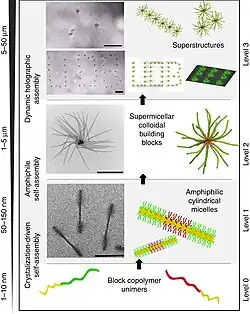 Les polymères peuvent également former des micelles sphériques en réponse à un changement de pH. Ce comportement peut se produire avec des copolymères à blocs linéaires. Si les différents blocs du copolymère ont des propriétés différentes, ils peuvent former des micelles avec un type de bloc à l'intérieur et un autre type à l'extérieur. Par exemple, dans l'eau, les blocs hydrophobes d'un copolymère pourraient s'assembler à l'intérieur de la micelle et les blocs hydrophiles à l'extérieur. En outre, un changement de pH pourrait inverser cette situation.