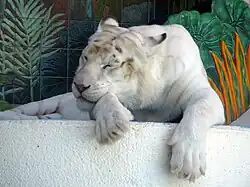 - ↑ Contre l'existence de tigres albinos, arguant que les rayures quoique très pâles sont toujours présentes, et que les tigres prétendûment albinos sont en fait des tigres leuciques très clairs : (en) Maxine Annabell, « Albino Tigers », sur lairweb.org.nz/tiger, Tiger Territory (consulté le ). Pour l'existence de tigres albinos différents des tigres leuciques : Xavier Marchant, « Tigre albinos », sur futura-sciences.com (consulté le ). Pour : Manimal World, « Tigre blanc ou tigre albinos ? », sur manimalworld.net.