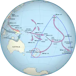 Entre la fin du IIIe millénaire et 1 500 av. J.-C., de nouvelles migrations permettent l'installation de groupes que l'archéologie désigne comme venant des Philippines au nord de Bornéo, à Sulawesi, à Timor et de là, les autres îles de l'archipel indonésien[11]. Vers 1 500 av. J.-C., un autre mouvement les mène de l'Indonésie vers la Mélanésie, les rives de la Nouvelle-Guinée et au-delà, les îles du Pacifique[11].