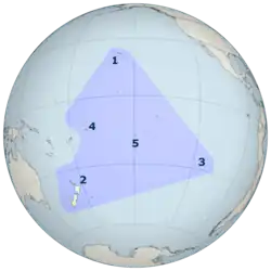 Traditionnellement[7], la Polynésie est délimitée par le triangle formé par Hawaii, la Nouvelle-Zélande et l'île de Pâques, appelé le « triangle polynésien ». Les îles Samoa et Tonga et la Polynésie française constituent les autres principaux groupes d'îles. Les Kiribati, dont l'archipel le plus occidental (gilbertin) est micronésien, fait tout de même partie de la Polynésie par la plus grande partie de son étendue (notamment maritime : îles de la Ligne).
