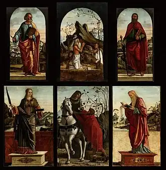 Les personnages sont peints sur un fond de collines rocheuses, sans traitement unitaire du paysage basé sur la perspective géométrique, mais, comme dans les œuvres de Gentile Bellini, avec une série de blocs séparés.