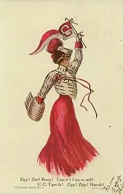 1903 voit la création de la première fraternité (Gamma Sigma) de cheerleaders[10],[11]. Le , la première card stunts (en) (séquence d'actions planifiées et coordonnées exécutées par un public, dont les membres lèvent des cartes et qui, dans l'ensemble, créent une image reconnaissable) est dirigée par l'étudiant Lindley Bothwell (en) pour encourager l'équipe de football américain des Trojans de l'université du Sud de la Californie[12],[13].