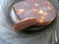 Les anciens grecs confisaient leurs pomme au miel[167]. Le melimelum est une pomme confite dans du miel qui faisait jadis partie de la pharmacopée[168].«Le melimelum, on en servait sur leurs tables, et les Apothicaires en employaient pour leurs sirops et autres compositions médicinales comme nous employons le sucre: ils en composaient diverses sortes de boissons, comme de l'hydromel qu'ils appelaient aussi Aqua mulsa, Melicratum, Apomeli» écrit Nicolas Lemery (1733)[169]. L'expression pomme confite désigne à la fois des pommes cuites et des pommes crues: «pomme confite dans le sucre, je note que j'ai gouté hier chez les pères jésuites des pommes conservées dans la marc de vin» (Paul Louis Martin, les Fruits du Québec)[170]. La pomme confite n'est pas une candy apple ou toffee apple, qui sont des pommes d'amour, pomme crue nappée de sucre cuit dont la version chinoise se fait de divers fruits de Crataegus épépinés (Cenelles, azéroles...), tanghulu (chinois simplifié: 糖葫芦; chinois traditionnel: 糖葫蘆; pinyin: táng húlu).