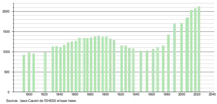 L'évolution du nombre d'habitants est connue à travers les recensements de la population effectués dans la commune depuis 1793. Pour les communes de moins de 10 000 habitants, une enquête de recensement portant sur toute la population est réalisée tous les cinq ans, les populations de référence des années intermédiaires étant quant à elles estimées par interpolation ou extrapolation[26]. Pour la commune, le premier recensement exhaustif entrant dans le cadre du nouveau dispositif a été réalisé en 2007[27].