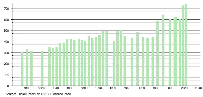 L'évolution du nombre d'habitants est connue à travers les recensements de la population effectués dans la commune depuis 1793. Pour les communes de moins de 10 000 habitants, une enquête de recensement portant sur toute la population est réalisée tous les cinq ans, les populations de référence des années intermédiaires étant quant à elles estimées par interpolation ou extrapolation[26]. Pour la commune, le premier recensement exhaustif entrant dans le cadre du nouveau dispositif a été réalisé en 2008[27].