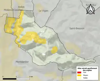 La commune est vulnérable au risque de mouvements de terrains constitué principalement du retrait-gonflement des sols argileux[22]. Cet aléa est susceptible d'engendrer des dommages importants aux bâtiments en cas d’alternance de périodes de sécheresse et de pluie. 23,3 % de la superficie communale est en aléa moyen ou fort (67,5 % au niveau départemental et 48,5 % au niveau national). Sur les 59 bâtiments dénombrés sur la commune en 2019, 51 sont en aléa moyen ou fort, soit 86 %, à comparer aux 90 % au niveau départemental et 54 % au niveau national. Une cartographie de l'exposition du territoire national au retrait gonflement des sols argileux est disponible sur le site du BRGM[23],[Carte 2].