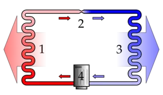 Selon le sens de fonctionnement du dispositif de pompage, une pompe à chaleur peut être considérée comme un système de chauffage, si l'on souhaite augmenter la température de la source chaude, ou de réfrigération, si l'on souhaite abaisser la température de la source froide. Pour la production de froid, le procédé est à la base de la quasi-totalité des climatiseurs et réfrigérateurs. Pour la production de chaleur, le procédé diffère du chauffage classique, dans lequel un corps est chauffé (par effet Joule, par combustion, ou par tout autre procédé).