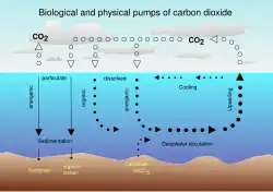 La combustion de combustibles fossiles, les changements d'affectation des terres et la production de ciment ont entraîné un flux de dioxyde de carbone vers l'atmosphère. À l'heure actuelle, on estime qu'environ un tiers (environ 2 gigatonnes de carbone par an)[2],[3] des émissions anthropiques de CO2 pénètrent dans l'océan. La pompe à solubilité est le principal phénomène à l'origine de ce flux, avec pour conséquence que le CO2 anthropique atteint l'intérieur des océans via des sites de formation d'eau profonde à haute latitude (en particulier l'Atlantique Nord). Par la suite la majeure partie du dioxyde de carbone émis par les activités humaines se dissoudra dans l'océan[4], mais la vitesse d'absorption n'est pas vraiment déterminée.