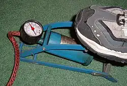 - Les pompes à pied, plus encombrantes, sont plus faciles à utiliser en raison d'une rapidité de gonflage et d'un moindre effort à fournir pour le gonflage des pneus. Souvent équipées d'un manomètre, elles permettent alors de connaître avec précision la pression insufflée dans le pneumatique.