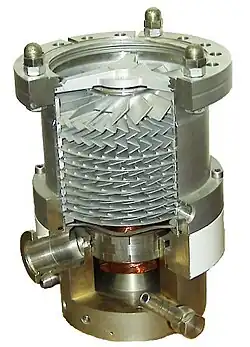 - pompes turbomoléculaires, moléculaires et hybrides, elles peuvent être conventionnelles sur roulements à billes ou sans contact grâce à l'utilisation de la sustentation magnétique,
