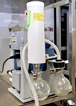 Pour réduire la perte d'huile de la pompe à vide, un séparateur d'huile est utilisé. Pour éliminer les contaminants de l'huile, un purificateur d'huile est utilisé[3].