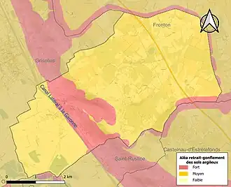 Le retrait-gonflement des sols argileux est susceptible d'engendrer des dommages importants aux bâtiments en cas d’alternance de périodes de sécheresse et de pluie. La totalité de la commune est en aléa moyen ou fort (92 % au niveau départemental et 48,5 % au niveau national). Sur les 552 bâtiments dénombrés sur la commune en 2019, 552 sont en aléa moyen ou fort, soit 100 %, à comparer aux 96 % au niveau départemental et 54 % au niveau national. Une cartographie de l'exposition du territoire national au retrait gonflement des sols argileux est disponible sur le site du BRGM[26],[Carte 3].