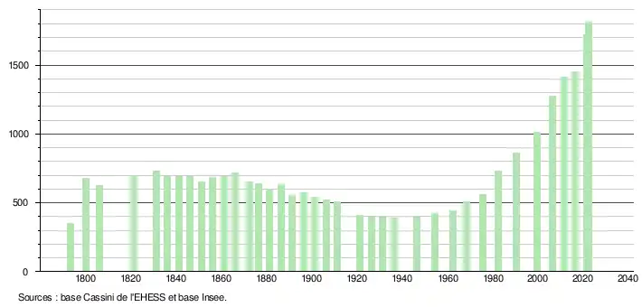 | L'évolution du nombre d'habitants est connue à travers les recensements de la population effectués dans la commune depuis 1793. Pour les communes de moins de 10 000 habitants, une enquête de recensement portant sur toute la population est réalisée tous les cinq ans, les populations de référence des années intermédiaires étant quant à elles estimées par interpolation ou extrapolation[36]. Pour la commune, le premier recensement exhaustif entrant dans le cadre du nouveau dispositif a été réalisé en 2006[37]. En 2022, la commune comptait 1 810 habitants[Note 10], en évolution de +24,57 % par rapport à 2016 (Tarn-et-Garonne : +3,12 %, France hors Mayotte : +2,11 %). |