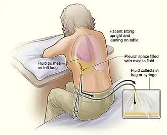 Une radiographie pulmonaire est réalisée avant l'opération; permettant de visualiser l'importance de l'épanchement et son côté. Comme avant la plupart des opérations, il est important de renseigner le patient sur les étapes de son déroulement. Une ponction pleurale se réalise sur un patient en position assise et en l'abordant par la partie postérieure de son thorax. Le niveau de la ponction est repéré par percussion de la paroi (matité). Après désinfection, l'anesthésie est effectuée. L'aiguille, munie d'une seringue, est insérée au niveau du site de la ponction, juste au-dessus de la côte inférieure, afin d'éviter nerfs et vaisseaux sanguins du paquet vasculo-nerveux qui se situe en dessous de la côte supérieure. Lorsque l'aiguille arrive au niveau de la plèvre (reflux de liquide) on effectue les prélèvements ou le drainage. L'aiguille est ensuite retirée d'un coup et un pansement est mis en place. Une échographie pleurale est parfois réalisée en même temps, ou peu avant pour guider plus facilement la ponction pleurale, permettant d'avoir un taux de complication moindre[2],[3]. Cette technique est particulièrement intéressante en cas d'un épanchement de petite taille ou cloisonné[4].